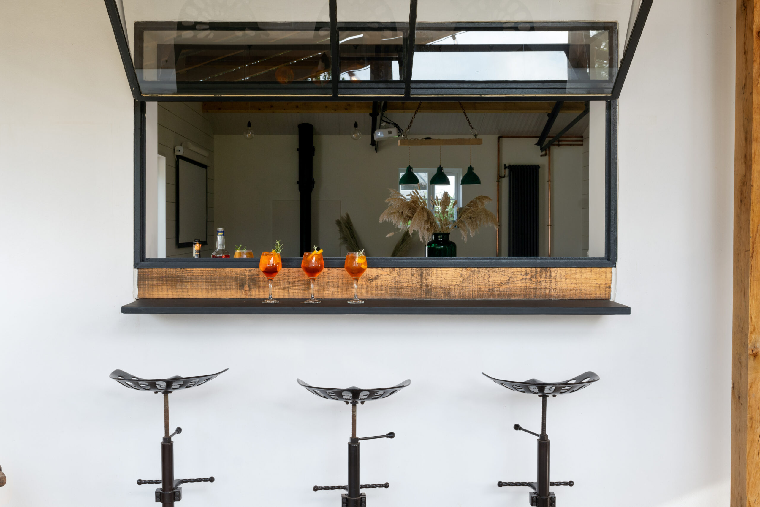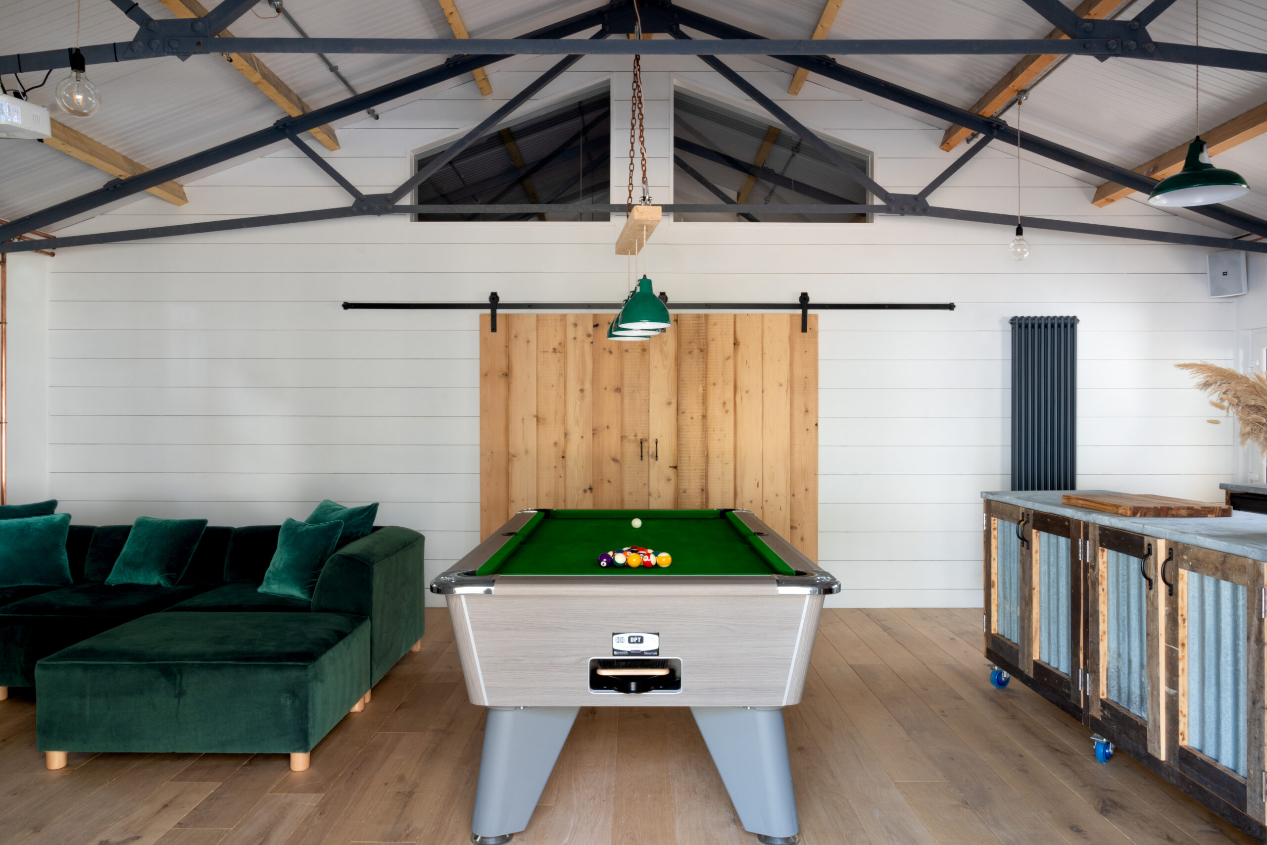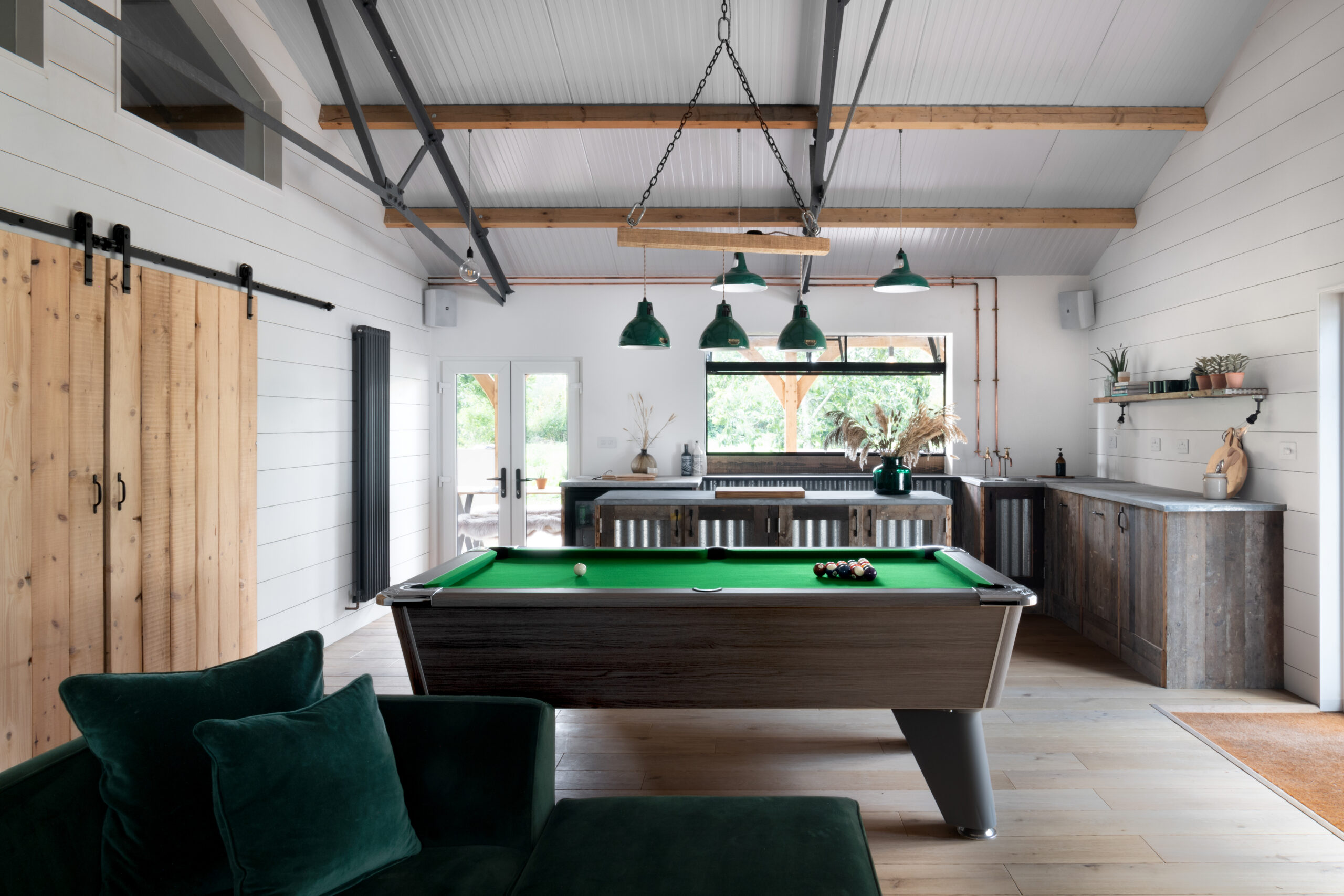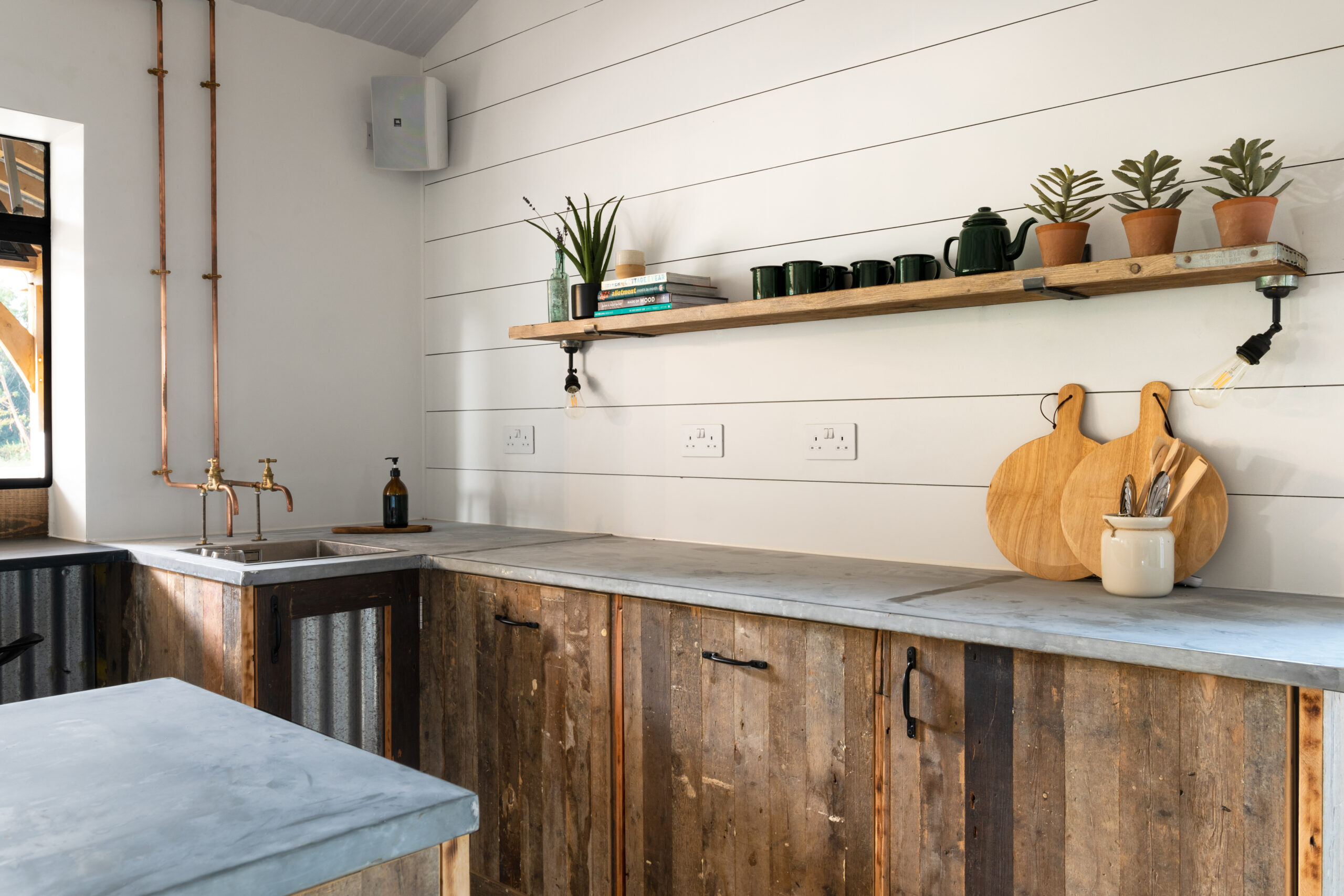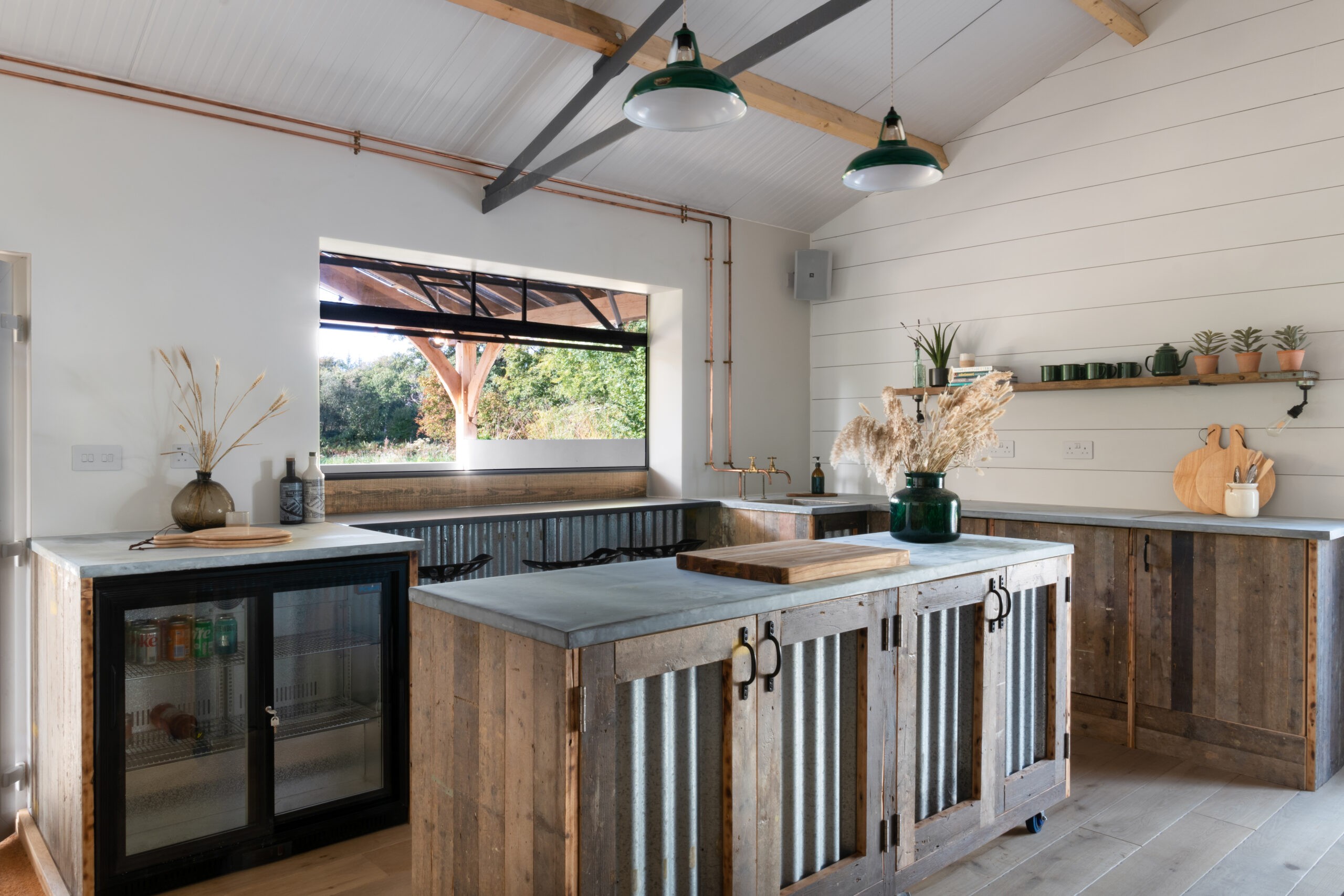 The design reflects the heritage of the building and we used plenty of recycled and repurposed materials from the old farm buildings and farmhouse. An old Crittall door that became an automated bar hatch, and a window was transformed into a mirror. The wriggly tin used to clad the showers was salvaged from the old roof. The kitchen area has a bespoke moveable island clad in more tin and beautiful reclaimed floorboards.