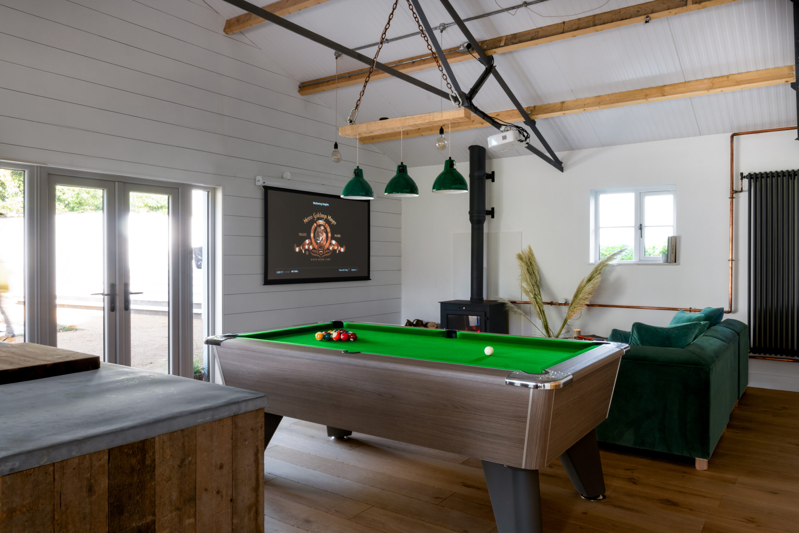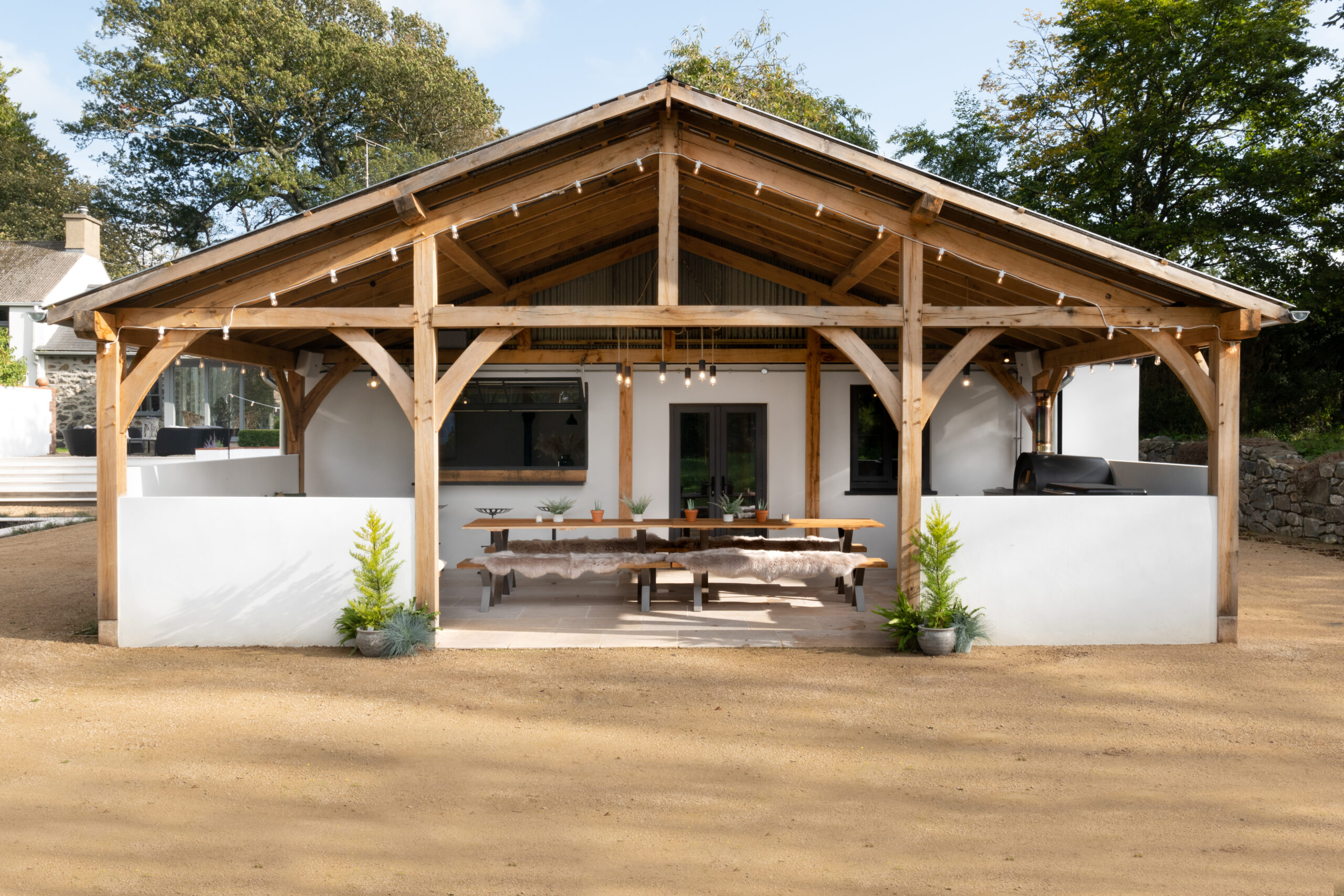 A couple of years after finishing the interior redesign of “In the Country” at Tyddyn Llwydyn the owners asked myself and Nick from Tex Decor to return to renovate an old dairy barn into a brand new entertainment and leisure space (some call the party barn!) This flexible space includes a gym, showers and changing room a cinema area with surround sound system and comfy seating and a bar area. We also added a bespoke oak framed outdoor dining and seating area with a BBQ and Pizza Oven so guests can cook up a storm outside what ever the weather.